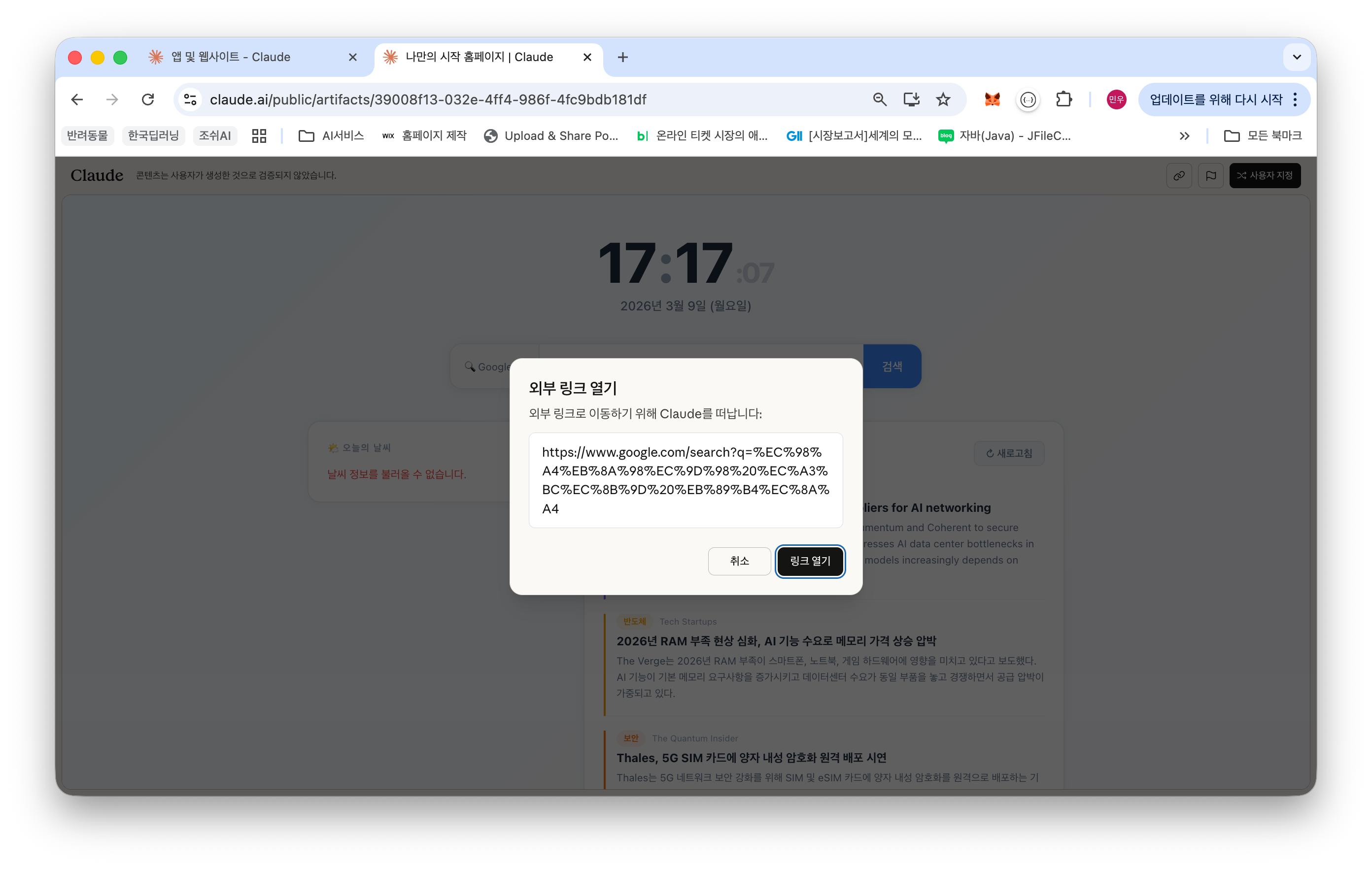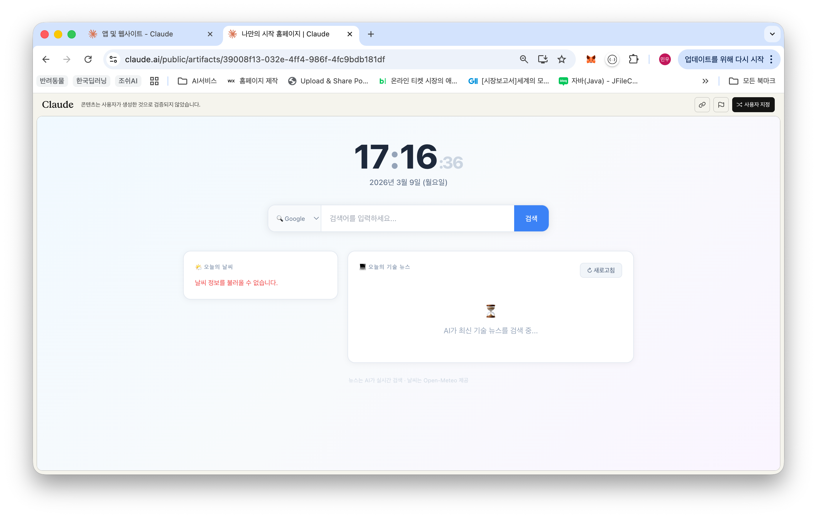 잠시 후, 첫 번째 결과물이 제 눈앞에 나타났습니다. 큼지막하게 현재 시각(16:58:13)과 날짜(2026년 3월 9일)가 표시되어 있었고, 그 아래에는 '오늘의 날씨'와 '오늘의 주요 뉴스' 섹션이 있었죠. 하지만... 여기서 작은 시행착오가 있네요. '오늘의 날씨'는 "날씨 정보를 불러올 수 없습니다"라고 뜨고, '오늘의 주요 뉴스'는 "뉴스를 불러오는 중 오류가 발생했습니다. 잠시 후 다시 시도해 주세요."라는 메시지가...? "크흡, 역시 한 번에 완벽할 수는 없으니까요." 하면서 "이래서 계속 공부하게 되네요" 라는 마음으로 오류 메시지를 읽어봅니다. 아무래도 날씨 API 연동이나 뉴스 데이터 로딩에 문제가 있었던 것 같아요. 하지만 이 정도는 AI와 대화하며 충분히 개선할 수 있으니까요.