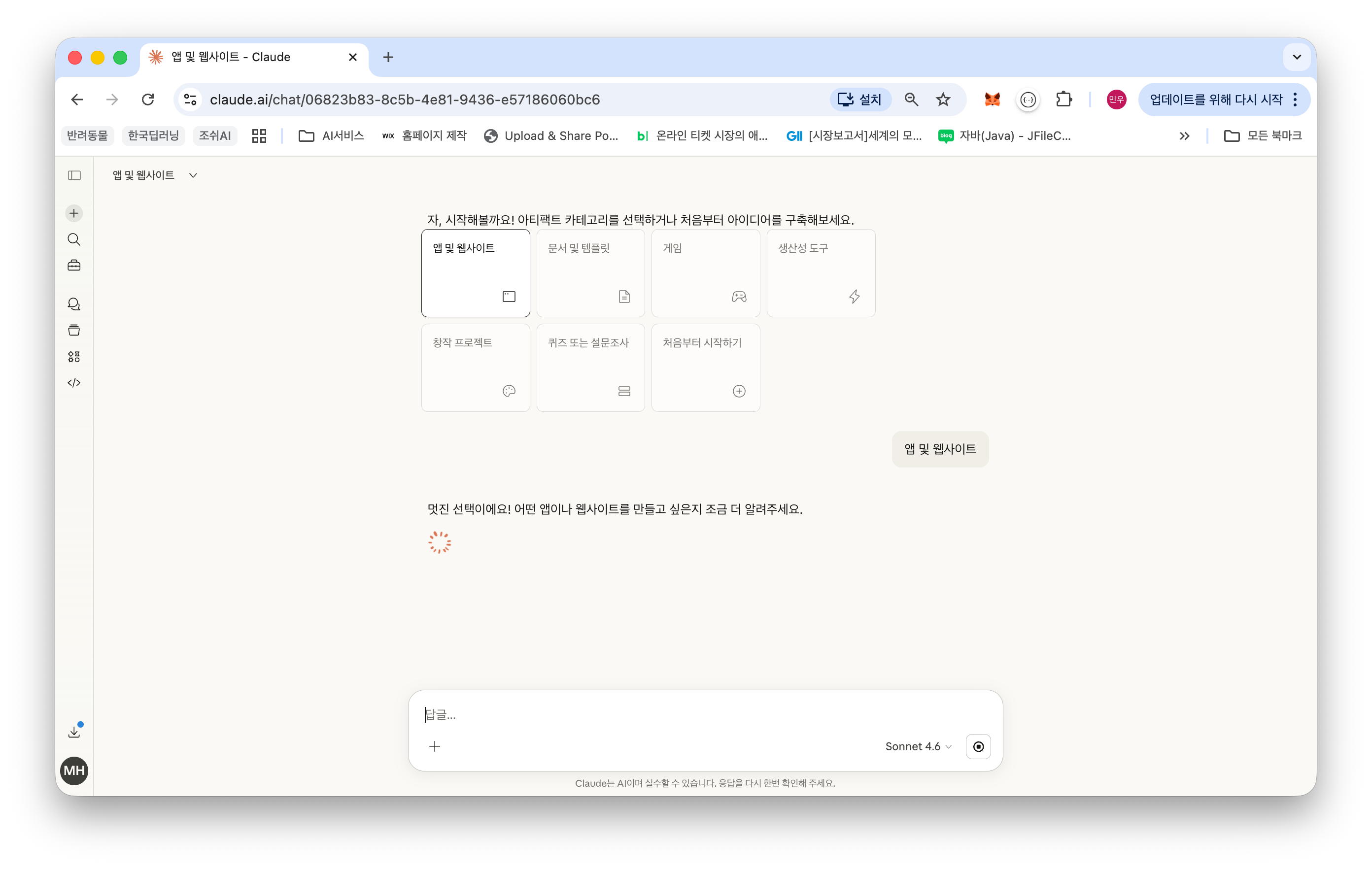 제일 먼저 마주한 화면은 다양한 아티팩트 카테고리였습니다. 글쓰기 에디터, 프로젝트 인사이트, 플래시카드 등등... 다른 것들을 클릭해보니, '앱 및 웹사이트', '문서 및 템플릿', '게임' 등 여러 가지 시작점이 있더군요. 그중에서 책에 있는대로 바로 '앱 및 웹사이트' 카테고리로 시작합니다.